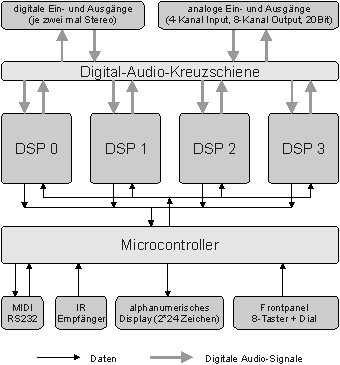 Die obige Abbildung zeigt ein vereinfachtes Blockschaltbild des DSP-Systems. Hier sind nur vier der sechs DSPs dargestellt, weil die restlichen beiden DSPs (DSP4+5) intern direkt den DA-Umsetzern zugeordnet sind und die Funktion von Oversamplern übernehmen.